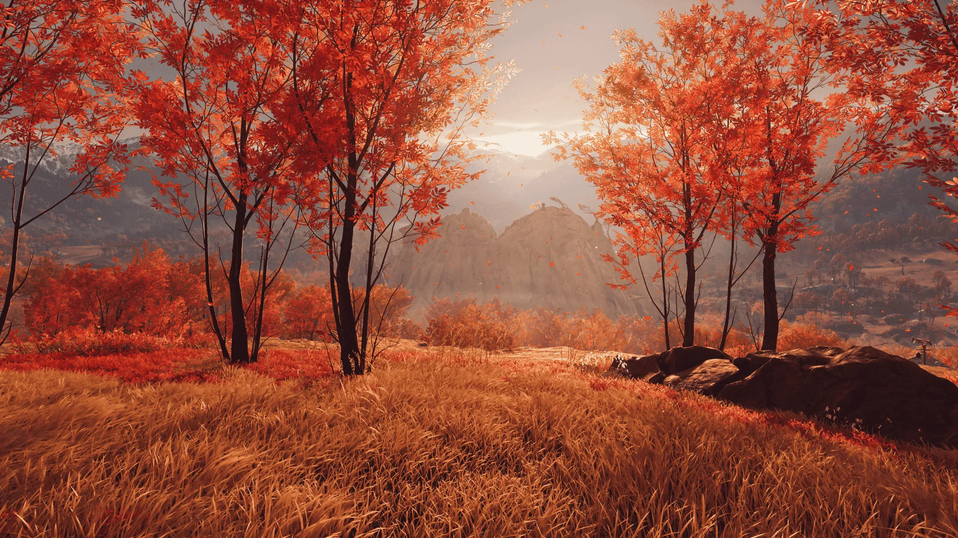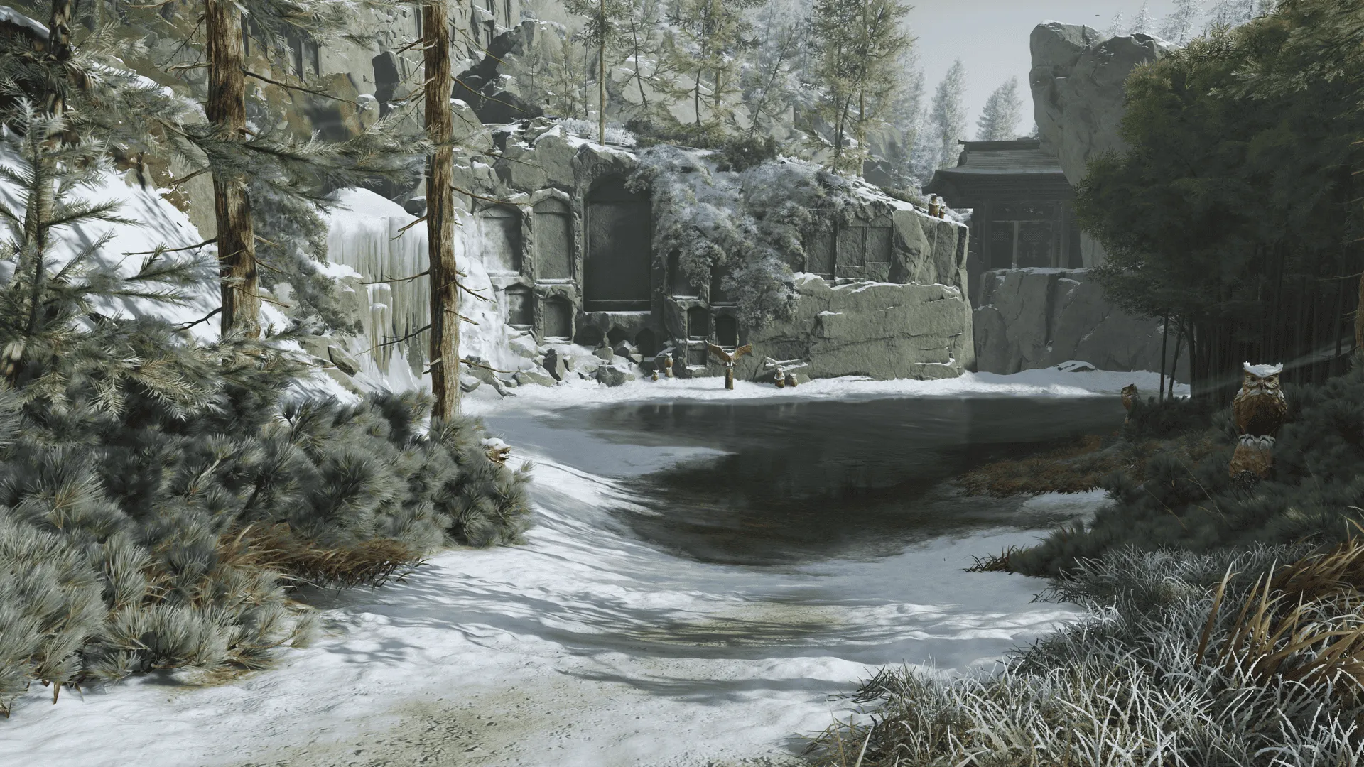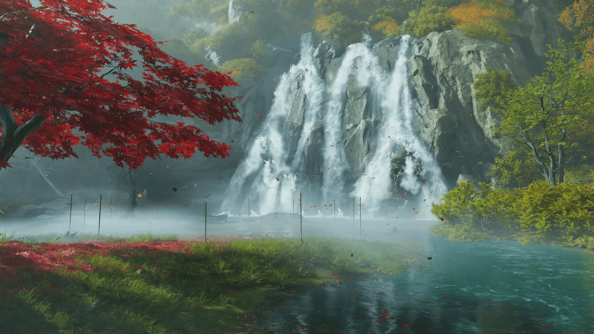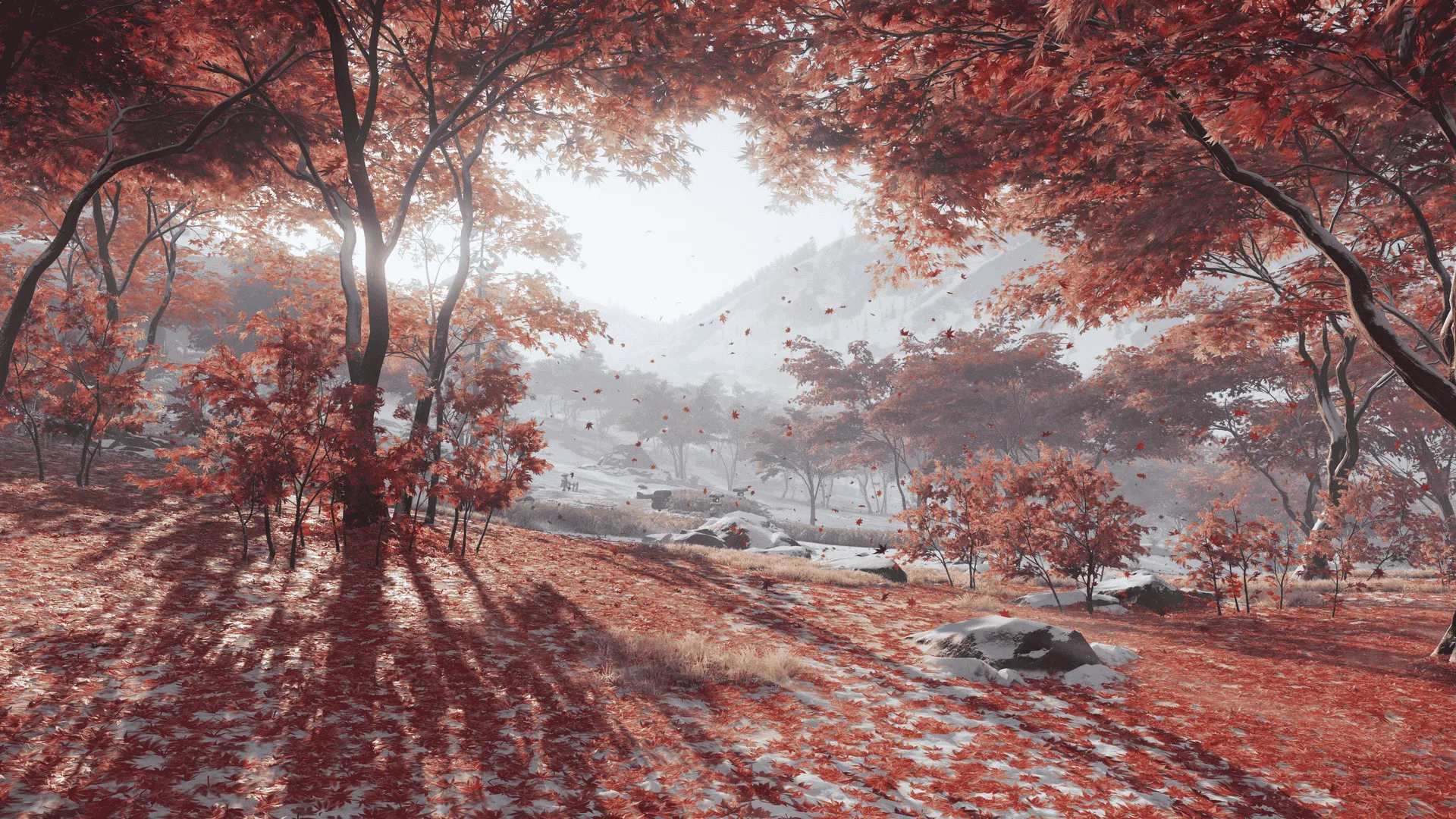 Optisch ist Ghost of Yōtei schlicht beeindruckend. Schneeflocken tanzen im Wind, Blätter glühen rot im Sonnenuntergang, und das Zusammenspiel aus Licht und Schatten sorgt für Kinoflair. Jeder Winkel von Ezo wirkt handgefertigt.
