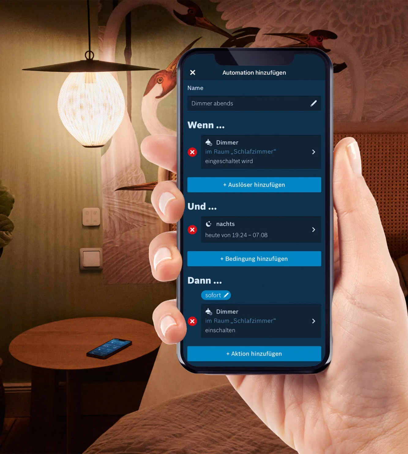 Noch smarter wird das Licht über Szenarien oder Automationen reguliert: Szenarien stellen mit einem Klick das Eigenheim ins richtige Licht; mit Automationen geht morgens zum Beispiel das Licht stufenweise an. Für alle NutzerInnen der Sprachsteuerung lässt sich der Bosch Smart Home Dimmer auch mit Amazon Alexa, Google Assistant oder Siri steuern.