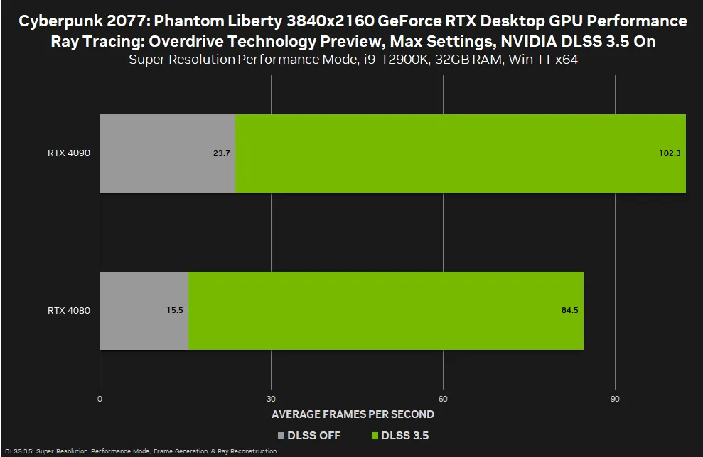 Das ultimative Cyberpunk-2077:-Phantom-Liberty-Erlebnis gibt es beim Ray Tracing: Overdrive Mode und über 60 FPS mit einer GeForce-RTX-40er-GPU. Bei 4K und aktiviertem Ray Tracing sowie maximalen Einstellungen ist NVIDIA DLSS 3.5 mit Frame Generation, Ray Reconstruction, Reflex und Super Resolution im Durchschnitt 4,9 Mal schneller als natives 4K-Rendering und sieht zudem wesentlich realistischer und immersiver aus: