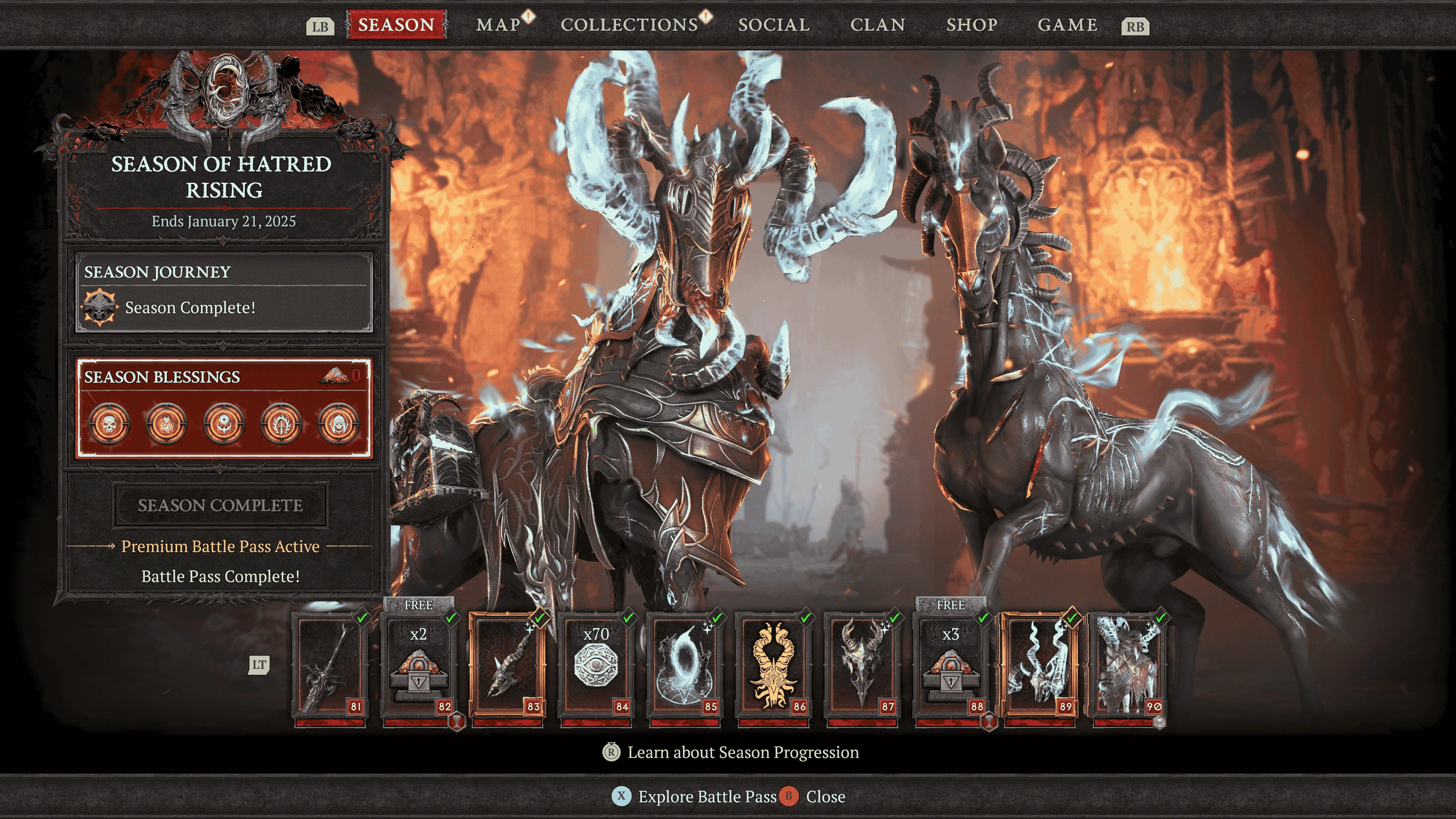 Season 6 trägt das Thema „Aufstieg des Hasses“ und soll vor allem mit der neuen Realmwalker-Mechanik glänzen. Diese Realmwalker erscheinen alle 15 Minuten zufällig in den Gebieten, und sobald man an diesem Event teilnimmt, setzt sich der Realmwalker in Bewegung. Während er unterwegs ist, spawnen zahlreiche Monster, die es zu besiegen gilt. Hat der Walker sein Ziel erreicht, müssen drei Türme zerstört werden, um Zugang zum „Brodelnden Reich“ zu erhalten. Hier kämpft man erneut gegen Horden der Hölle und kann Buff-Materialien sowie Loot erbeuten.