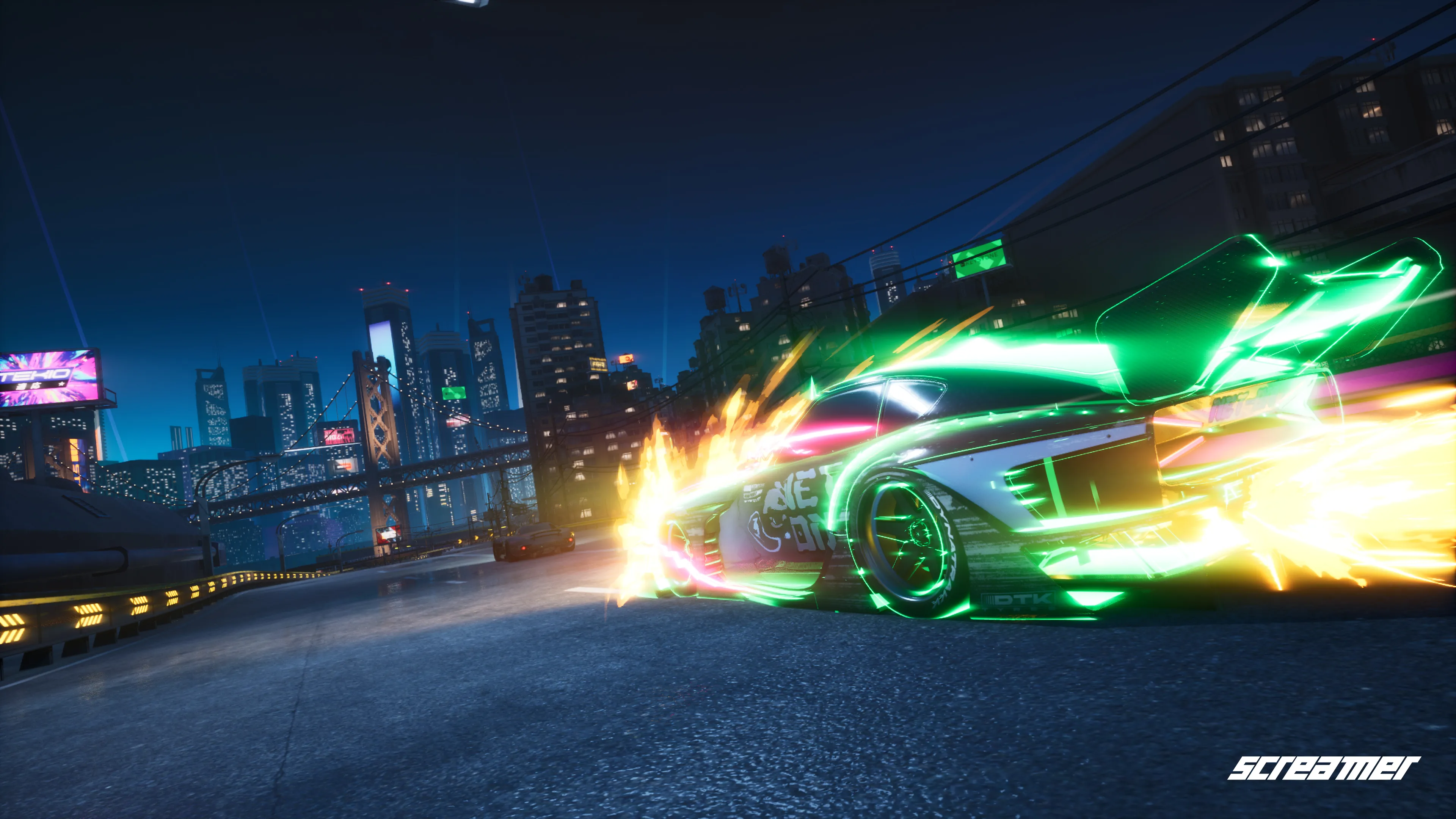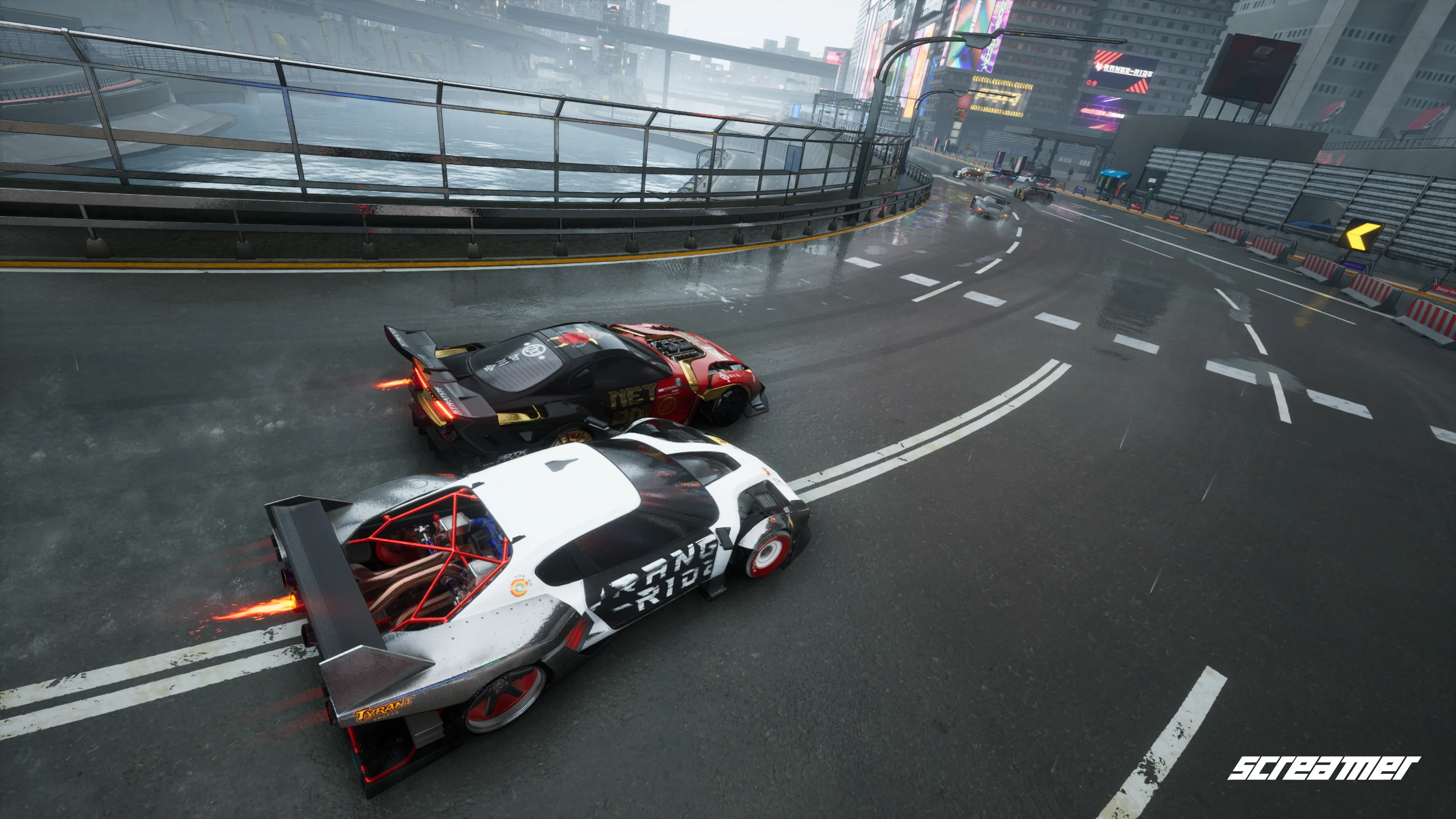Optisch verfolgt Screamer eine klare stilistische Vision. Anstelle von Fotorealismus setzt das Spiel auf Cel-Shading, kräftige Farben und einen starken Anime-Einfluss, wodurch eine unverwechselbare visuelle Identität entsteht. Die Fahrzeuge sind nicht lizenziert, sondern vollständig eigenständig designt. Dadurch wirken sie individueller und fügen sich besser in das Gesamtbild des Spiels ein. Besonders bei hohen Geschwindigkeiten und dynamischen Wettereffekten, etwa bei Regenrennen, entfaltet das Spiel eine beeindruckende Atmosphäre.
