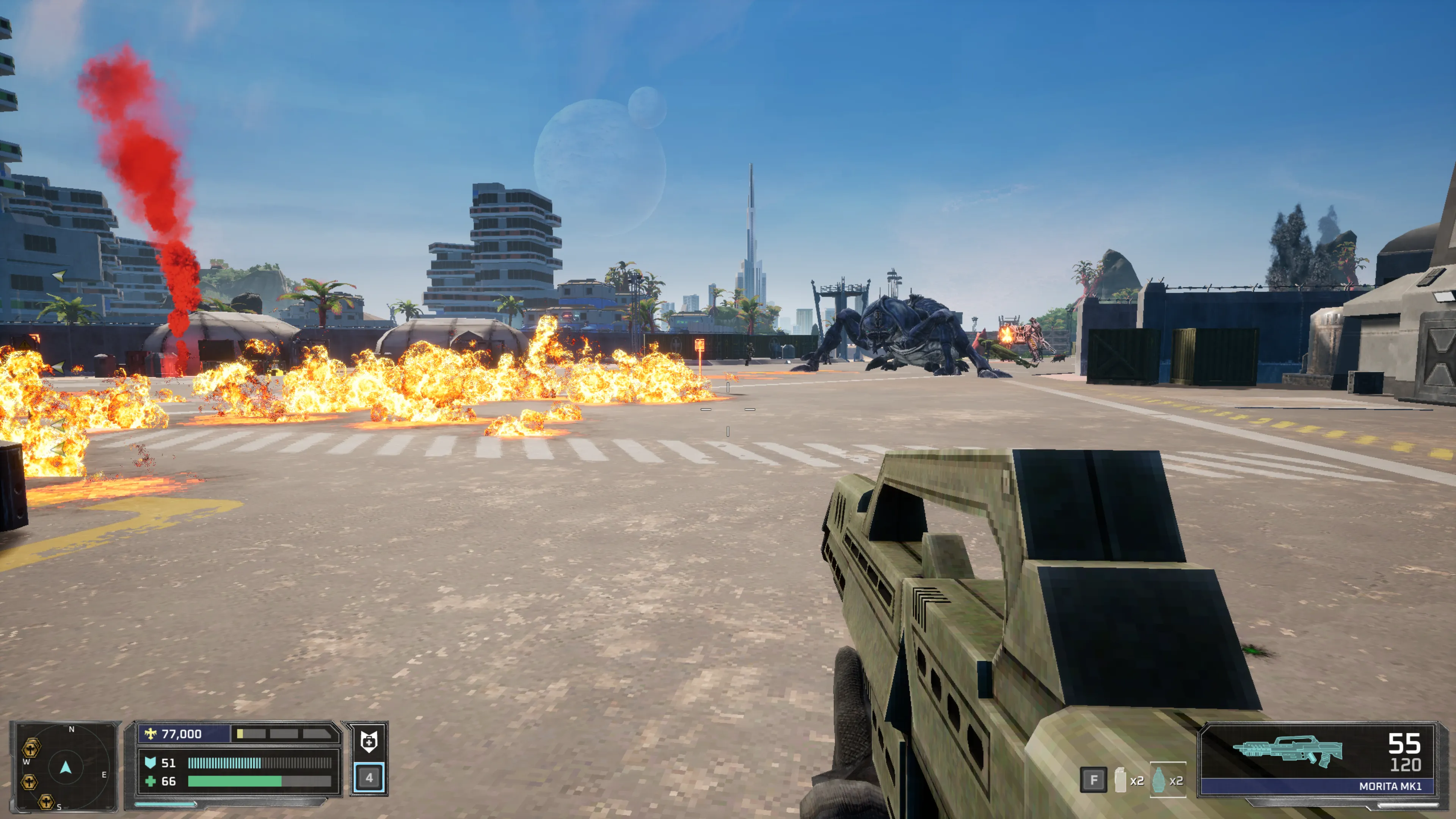 Das Herzstück des Spiels ist ohne Frage das kompromisslose Ballern. Die Waffen fühlen sich wuchtig an, Treffer haben spürbares Feedback, und gerade auf höheren Schwierigkeitsgraden entsteht ein angenehmes Gefühl von Chaos und Überforderung – ganz im Sinne der Filmvorlage. Besonders gelungen ist der Einsatz von Unterstützungsmaßnahmen wie Luftschlägen, orbitalen Lasern oder sogar nuklearen Angriffen. Diese sorgen regelmäßig für spektakuläre Momente und setzen sich positiv vom Standard-Shooter-Einerlei ab.